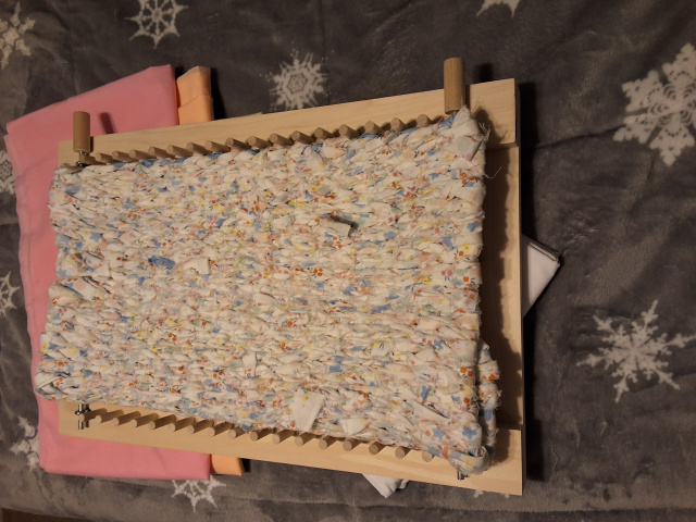 simple wooden frame used to make rag rugs, mats, chair pads. Instead of weaving over - under with a shuttle,